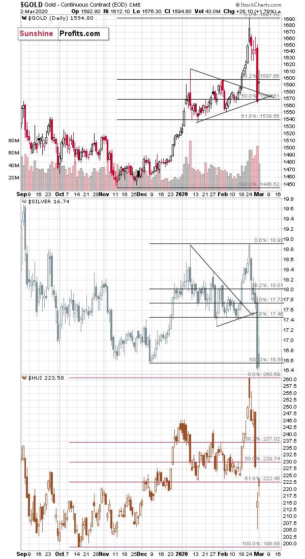 In many cases, gold's $28 upswing would be viewed as something significant. But not yesterday, as such moves should be considered on a relative basis. Compared to how volatile gold was on Friday, and how much it dropped, it "should have" erased at least half of the preceding decline, preferably more. And it should have done away with a sizable portion of our profits (we entered the short positions in gold, silver, and mining stocks on Feb 21st). Gold was unable to do that.