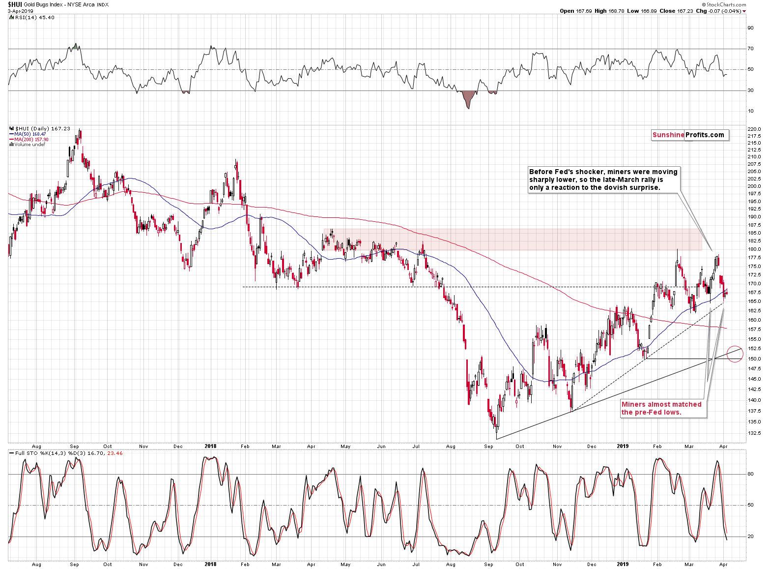 The HUI Index moved higher yesterday, touched its 50-day moving average and then turned south once again. The breakdown below it has been verified. Since the 50-day MA is currently almost exactly at the mid-March low in terms of the closing prices, we can say that the breakdown below it has also been verified.