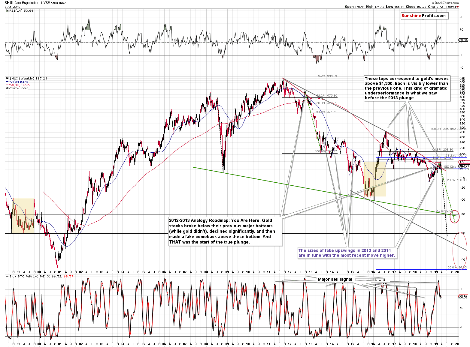 Gold stocks’ long-term chart shows similarities to the 2012-2013 decline, but we covered these issues thoroughly exactly one month ago, and since they remain up-to-date, we don’t want to go through them once again here. If you didn’t read the Alert about the link between now and the 2012-2013 drop and the myriads of confirmations for this analogy, we strongly encourage you to do so today.