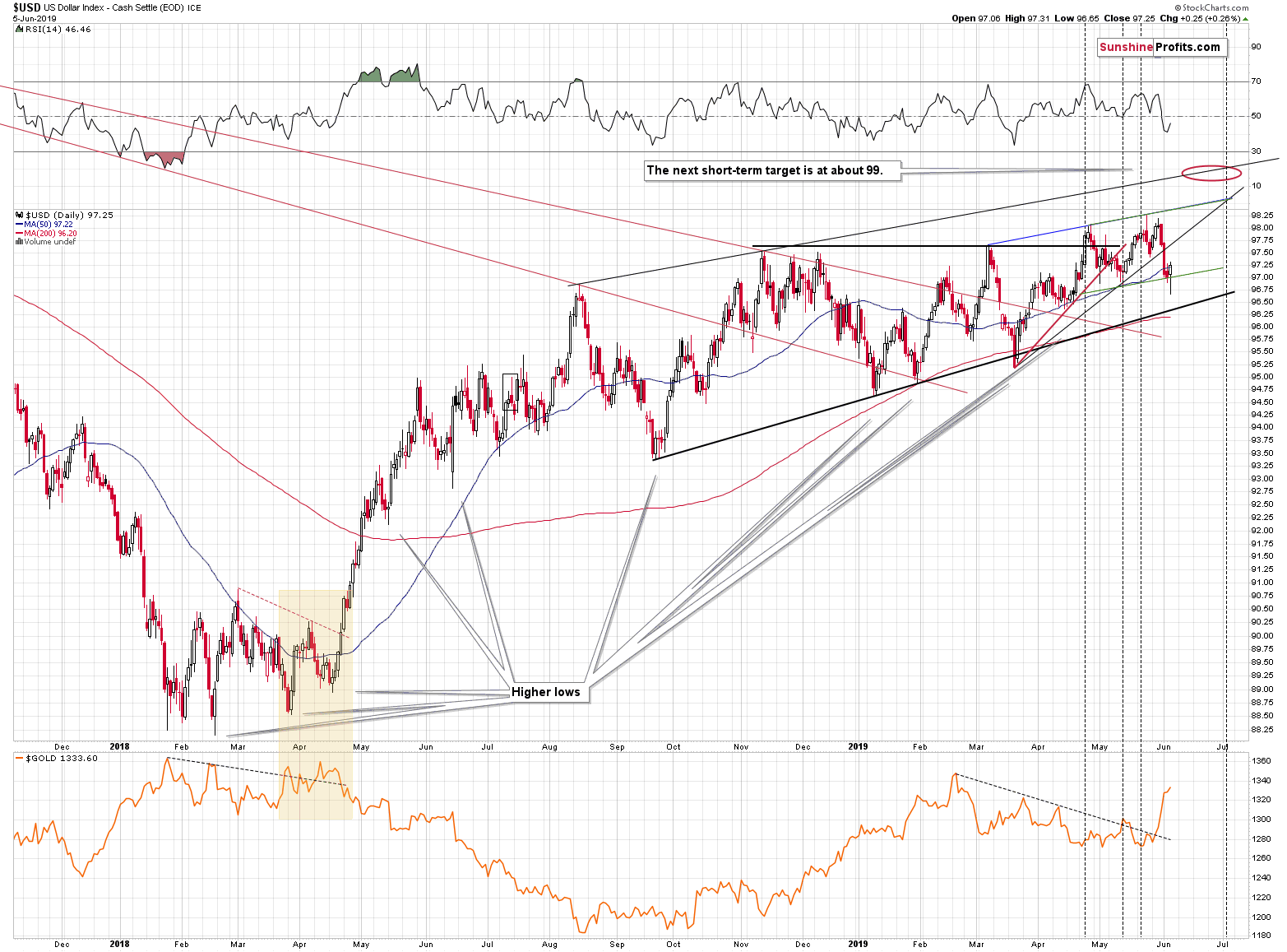 That was the case in late February 2019, then on the last day of January 2019 and in the following days, and finally in early July 2018. But, there are also other cases. For instance, the December 18, 2018 reversal. It was followed by USD's decline and gold's rally. The most recent example is May 1 - the USD Index reversed in a clear manner and it even rallied on the following day. But gold just paused and then continued to move higher for several additional days.