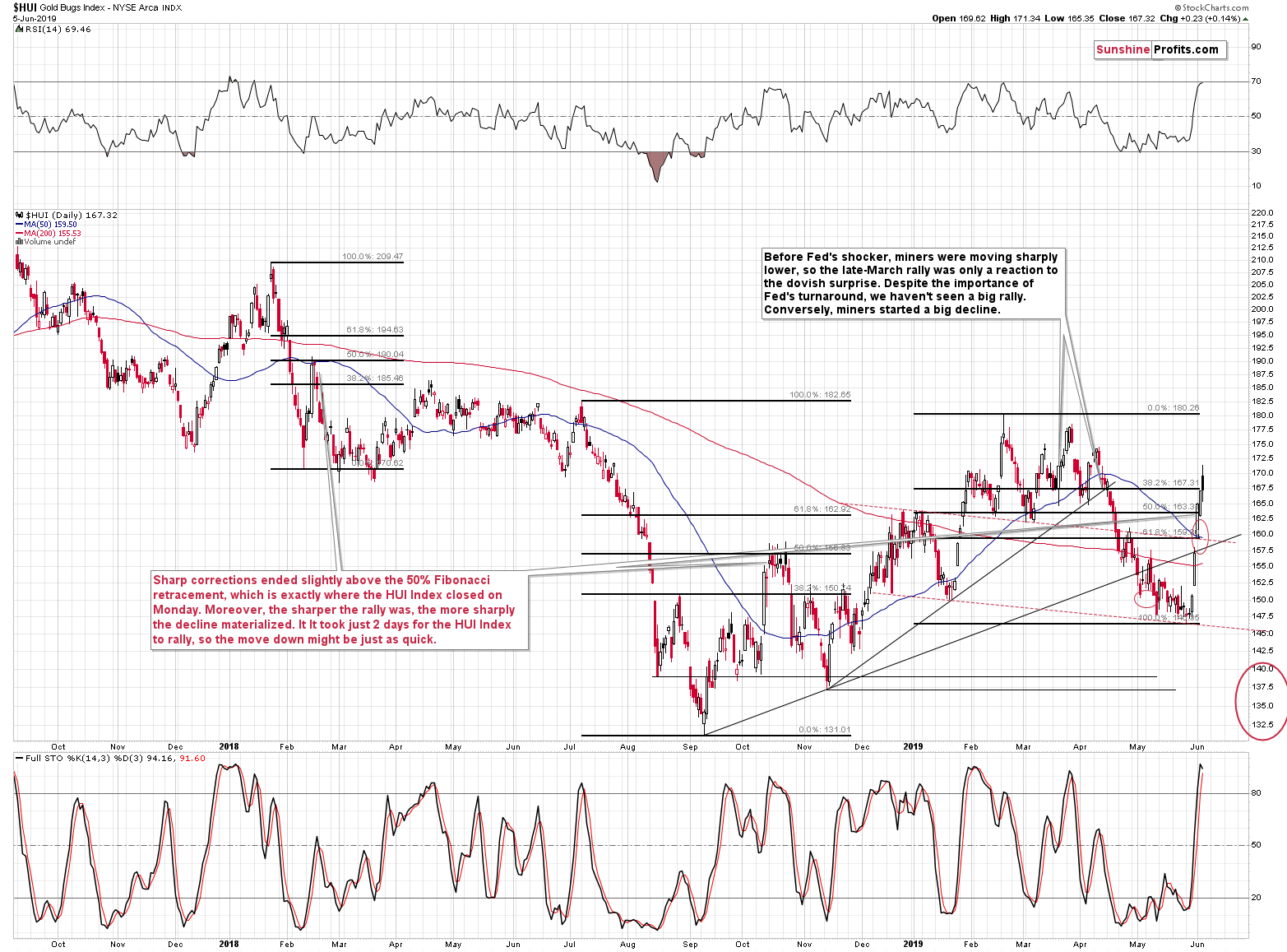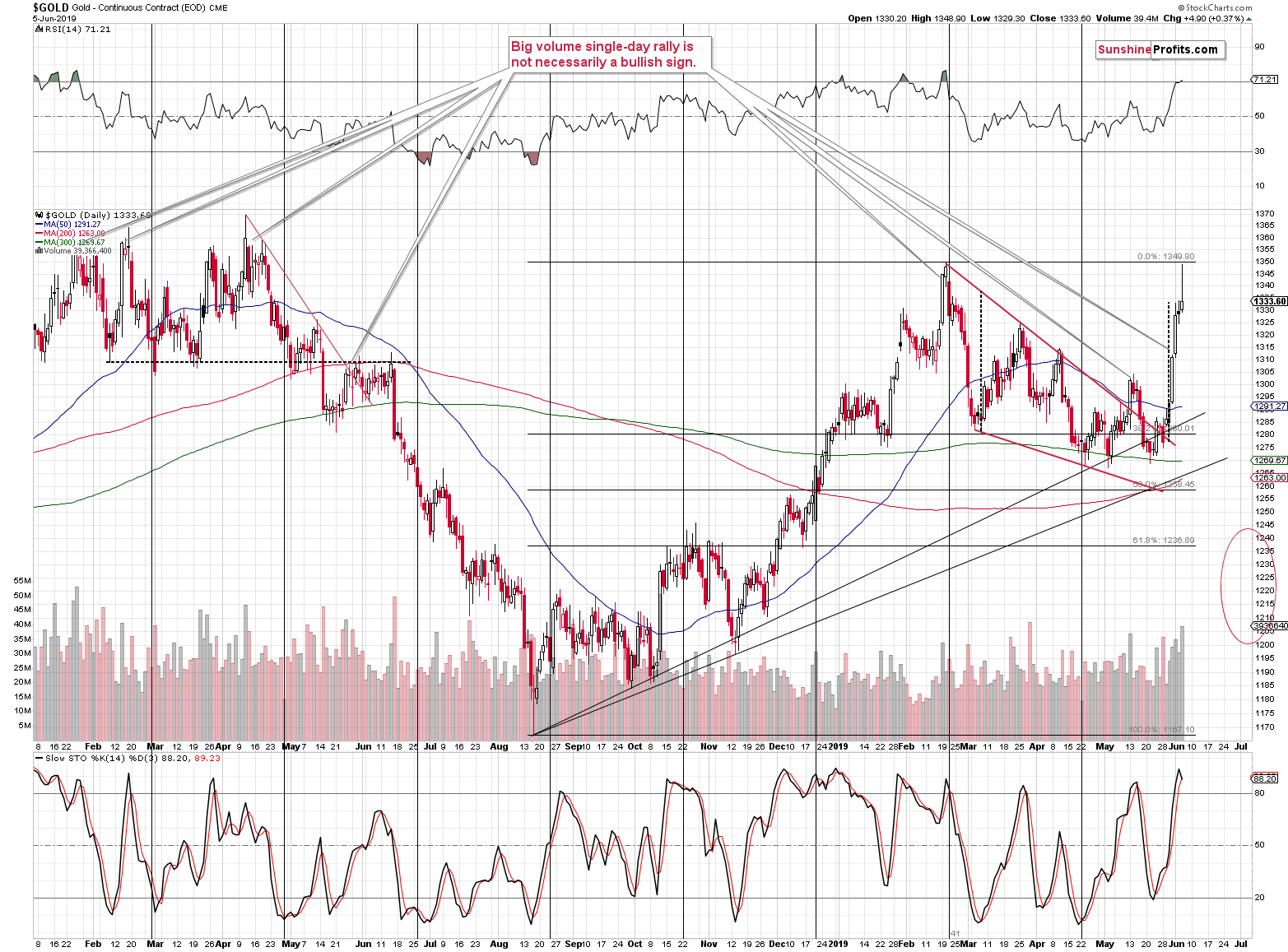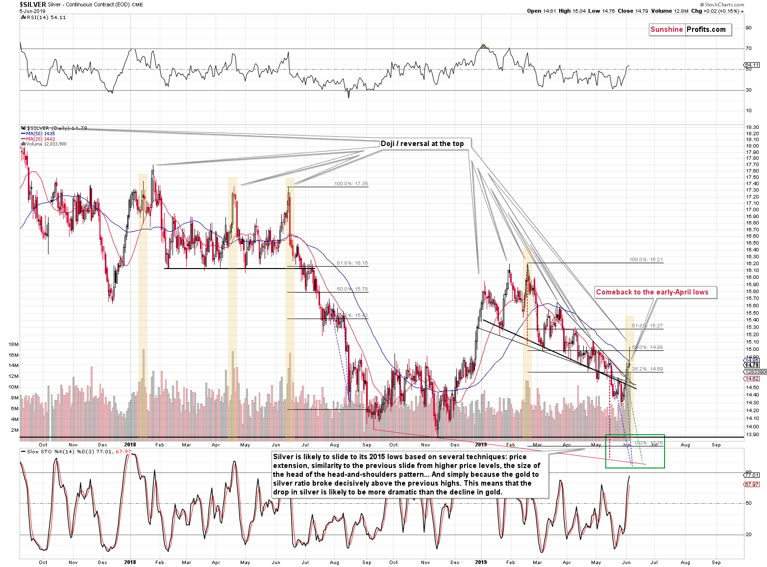If there was just a single surprising development, we could apply the above 5-day rule and say when the top is more or less likely to take place in a similar way. But, there was a series of surprising news. The increasing trade tensions with China, the Mexico tariff issue, the Fed's dovish response, and then some more trade tensions. Consequently, it's difficult to say how much longer can we see rising gold prices.