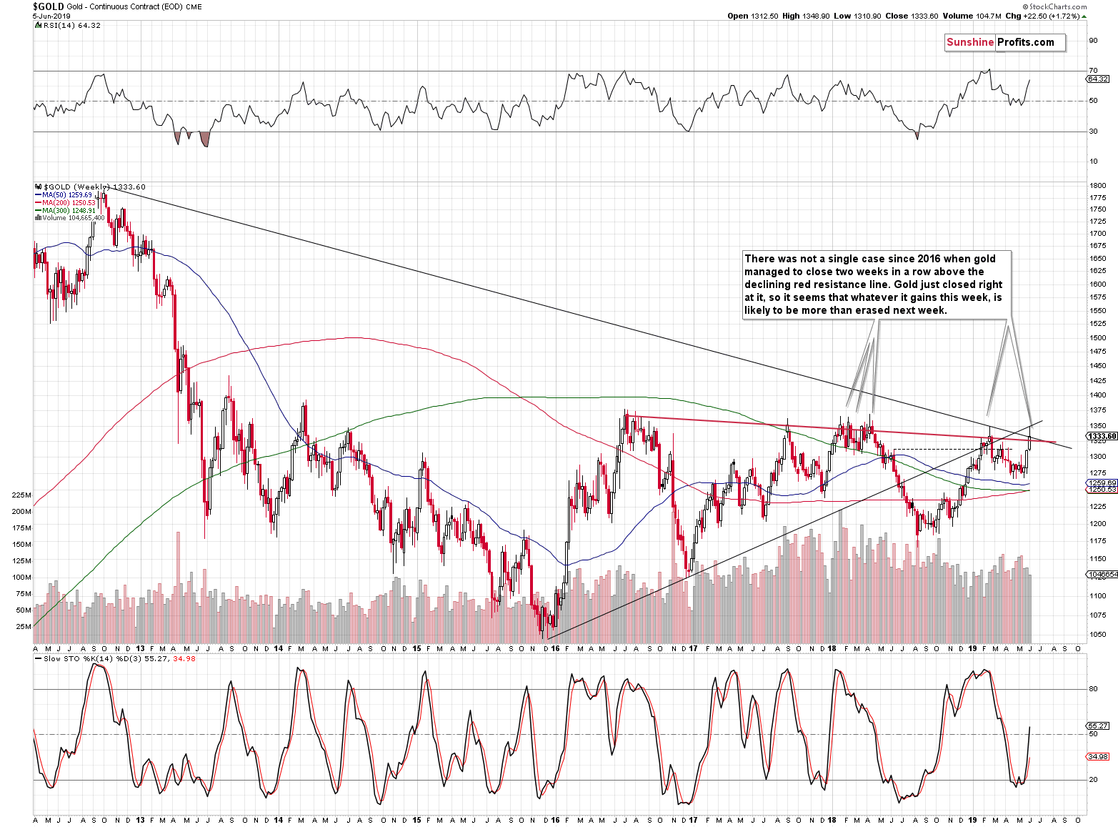 Gold is approaching its long-term resistance created by the previous highs. There is one very interesting rule regarding this resistance. No matter how volatile or promising the rally above the red resistance line was, it was always (in the last couple of years) invalidated in the following week. Given today's pre-market rally in gold, it seems that we might see a weekly close above it. This means that the next week would quite likely include the invalidation of the current breakout and the beginning of another slide lower.