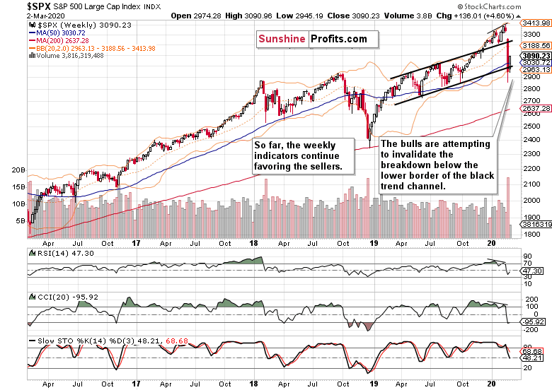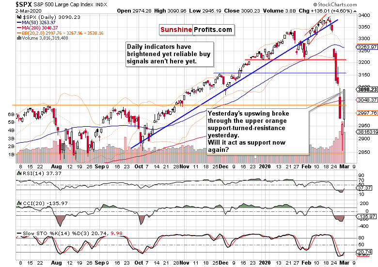 Summing up, the medium-term S&P 500 outlook has improved with yesterday's price action, and while more downside remains probable before this correction is over both in time in in price, the very short-term balance of forces appears to favor the bulls. The monetary policy response expectations haven't been questioned yet, and there hasn't been any coronavirus-related development that would send stocks into a tailspin. Therefore, opening long positions is justified from the risk-reward perspective.